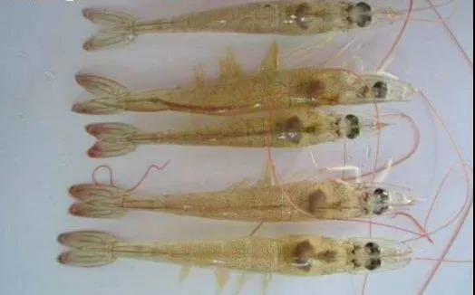 对虾感染哈维氏弧菌的发病初期,幼体活动能力减弱,游于水中的中下层,糠虾及仔虾弹跳无力,摄食减少或不摄食,身体发白,频死或死亡的幼体会发荧光。成体发病先是头胸部、腹部的腹面发荧光,严重时全身发光。育苗场中常见,尤其到了仔虾阶段。