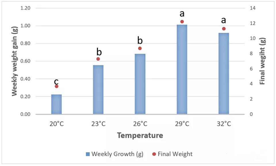 2、正如预期的那样,与 26、23和20摄氏度组相比,来自温度为29摄氏度和32摄氏度的虾,显示出显着的最终生长增益(图2),其中29摄氏度下的虾生长增益最佳。这些结果的有趣之处在于,在恒定温度下,平均每周生长增长与最终重量相对应。