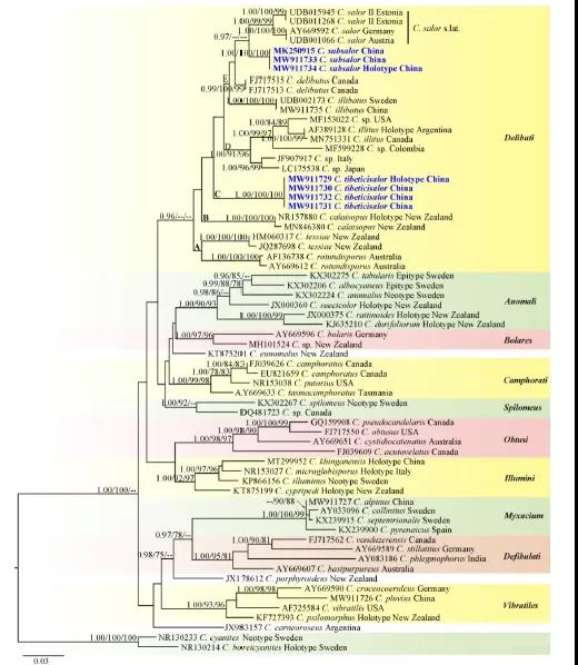 在李玉院士指导下,采用宏观特征、显微结构等传统分类学研究方法,取子实体组织提取DNA,进行基因扩增和测序,基于ITS进行系统学分析,分子系统学分析结果表明,该物种独立为一个支系,确定为全球新物种,该新种定名为近蓝紫丝膜菌(Cortinarius subsalor)。