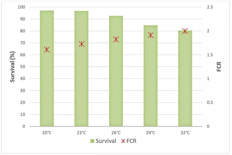5个试验温度组的存活率在80%~97%之间,饲料系数(FCR)在1.25~2:1之间。在20℃和23℃这两个最低温度组中,观察到最高的存活率和最高的FCR值(图1)。